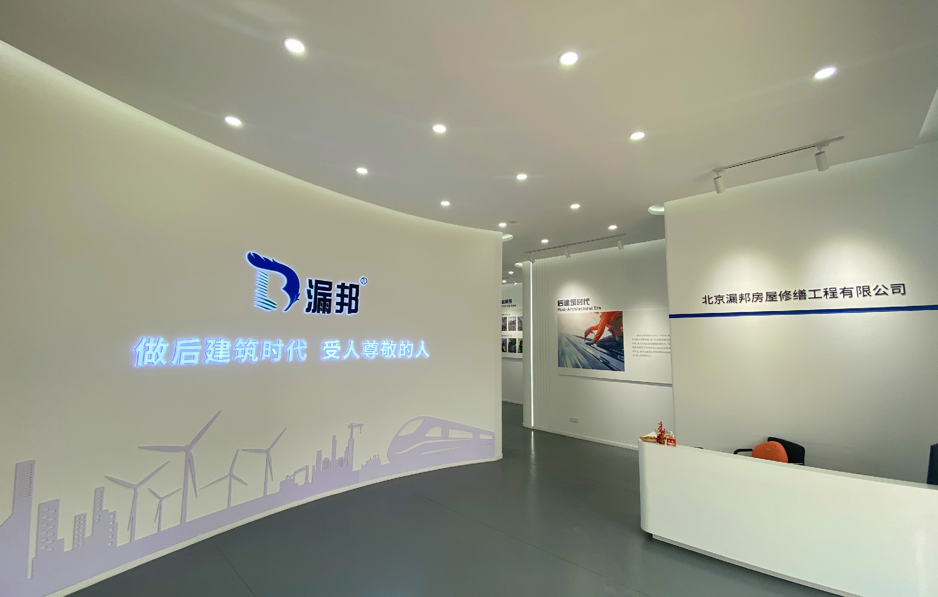 2023年9月14日中铁建领导任总莅临漏邦房屋修缮有限公司进行参观交流。漏邦房屋修缮董事长薛峰带领客户参观漏邦自主研发的防水涂料。带领客户参观公司文化长廊。观看漏邦房屋修缮组织的携手运河湾公益活动。参观完毕后大家一同拍照留念。